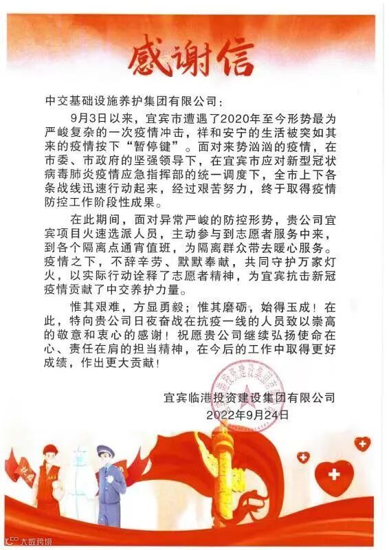 近日,宜宾临港投资建设集团有限公司向公司发来一份感谢信,对公司全方位支持配合疫情防控工作的表现给予高度评价,感谢在疫情防控期间冲锋在前、坚守一线、默默付出的志愿者,用实际行动诠释了央企的责任和担当。