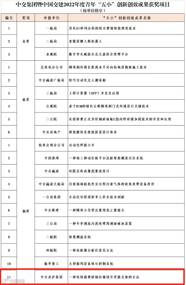 近日,中交集团“科技闪耀未来 创新成就梦想——让科技点亮青春梦想”第三届青年创新创效项目评审结果公布,公司推荐的《一种连续箱梁桥独柱墩顶升更换支座的方法》从36家单位的69项成果中脱颖而出,获中交集团暨中国交建2022年度青年“五小”创新创效成果铜奖。
