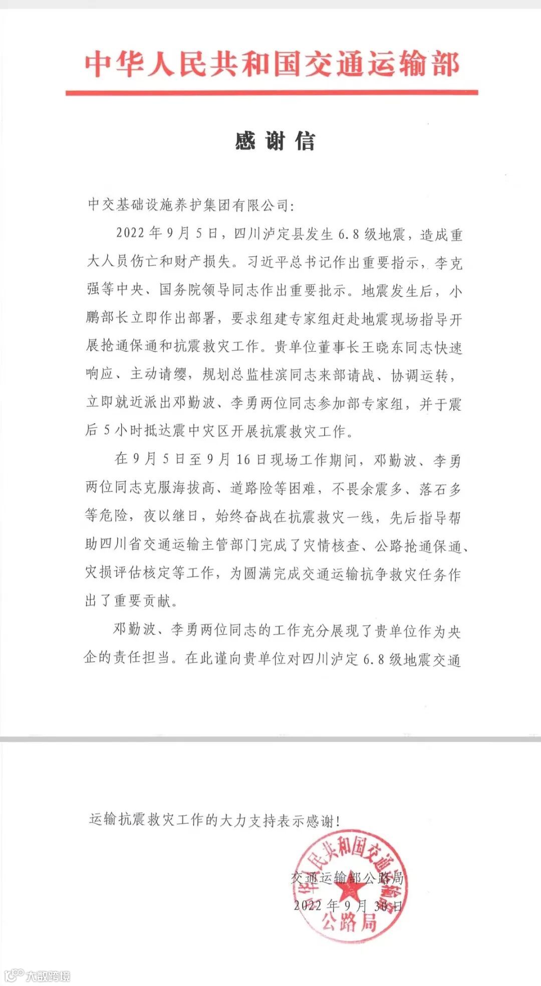 近日,公司收到来自交通运输部公路局的感谢信,信中对公司闻令而动、不惜代价驰援四川9.5泸定地震交通运输抗震救灾工作表示衷心感谢。对公司领导第一时间统一安排部署,派出专家团队参与抗震救灾工作,克服海拔高、道路险等困难,不畏余震多、落石多等危险,夜以继日、始终奋战在抗震救灾一线,为圆满完成交通运输抗震救灾任务作出贡献表示高度赞许。
