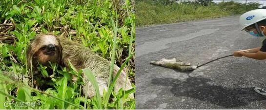 哥斯达黎加被称为野生动物的天堂,拥有非常丰富的物种。施工区域总有树懒、巨嘴鸟、猴子、蛎蜥、鳄鱼、鳄龟等野生动物光顾。大家尽可能不惊扰动物的正常活动,保护桥下动物的栖息环境,必要时为它们提供保护和帮助。树懒是当地动物的重要代表,因行动迟缓,且沿线动物通道建设还未完善,他们越过道路或桥面时容易被往来车辆碾压,一旦发现有野生动物要横穿马路,我们会临时封闭交通,为它们建立安全屏障,协助其安全通过。