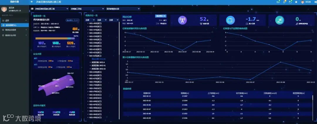 青风岭隧道右线全长1617米,隧址地形陡峭、地质复杂,主要为灰岩地层,多为浅埋段,有断层破碎带,施工难度大。为保证隧道施工安全高效推进,项目严格落实短步距、勤监测等防控措施,针对青风岭隧道特点,项目人员科学规划,配合施工单位的不同开挖方法有针对性地优化测点布设方案,根据揭露围岩情况动态调整监测频率,应用手机测量APP直接连接仪器将测量数据存储并上传,保证了测量数据的真实性、信息反馈的及时性及指导施工的有效性,帮助施工单位动态调整开挖及支护工艺,并提前一个月顺利完成贯通。