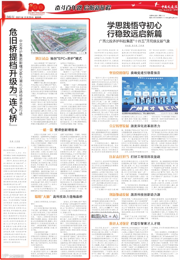 12月23日,《中国交通报》第36版刊登题目为《危旧桥提档升级为“连心桥”——中交养护集团新模式鼎力湖北公路桥梁消危行动》文章,报道了公司积极参与湖北省公路桥梁三年“消危行动”,以“出手即是精品”的模式创新、管理创新和技术创新,让危旧桥梁变成惠及群众的“连心桥”。