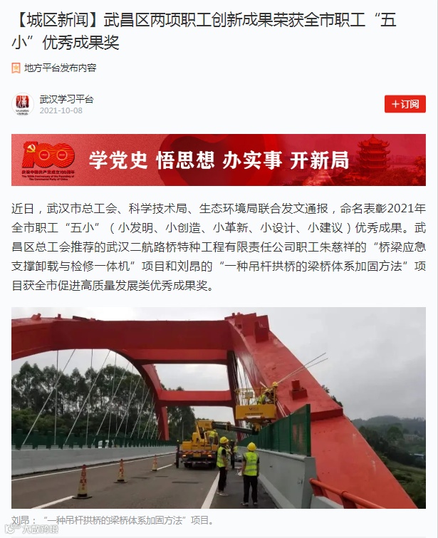 近日,武汉市总工会、科学技术局、生态环境局联合发文通报,命名表彰2021年全市职工“五小”(小发明、小创造、小革新、小设计、小建议)优秀成果。武昌区总工会推荐的武汉二航路桥特种工程有限责任公司职工朱慈祥的“桥梁应急支撑卸载与检修一体机”项目和刘昂的“一种吊杆拱桥的梁桥体系加固方法”项目获全市促进高