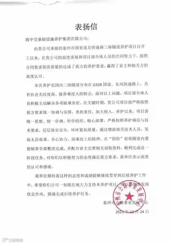 近日,中交养护承接的泰州市国省道及快速路三座隧道养护项目收到泰州市公路事业发展中心的表扬信,对项目组严格按照合同要求保质保量完成养护工作提出表扬。