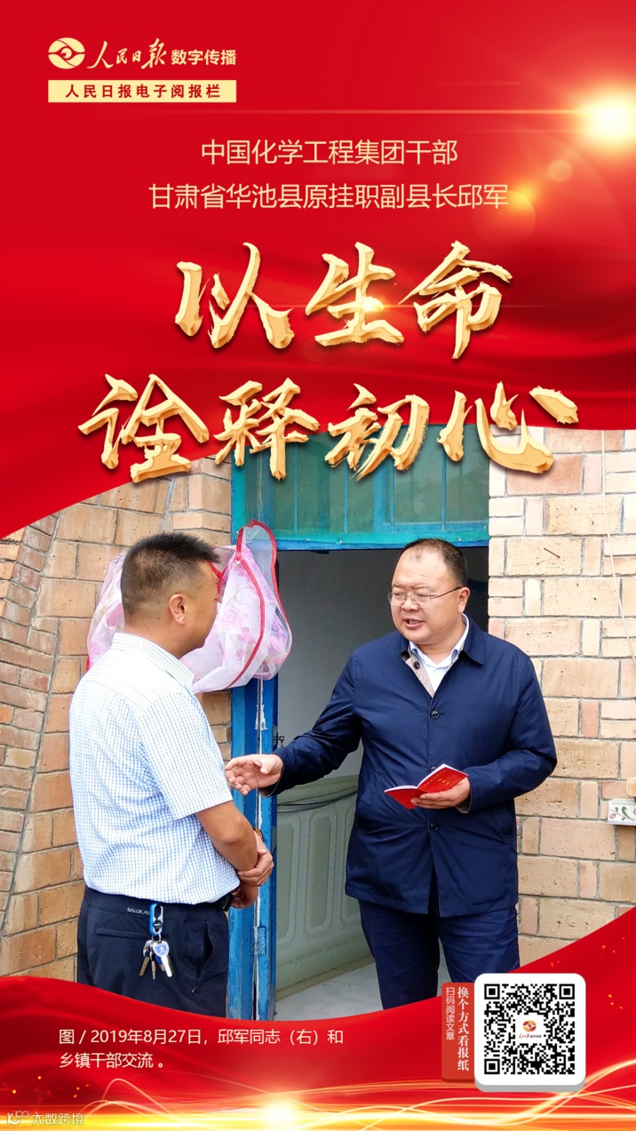 2018年12月,37岁的邱军,从中国化学工程集团有限公司到甘肃省华池县挂职副县长,2021年1月8日因病去世。来到华池后,邱军推广奶牛养殖、沙棘育苗,紧抓技能培训、促进劳务输出……2019年华池县整体脱贫,邱军被评为甘肃省脱贫攻坚帮扶先进个人。2021年2月,全国脱贫攻坚总结表彰大会中,邱军荣获“全国脱贫攻坚先进个人”称号;2021年6月,国资委授予邱军2021年“央企楷模”荣誉称号。