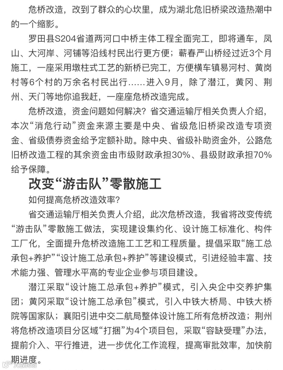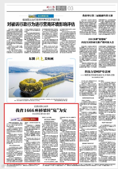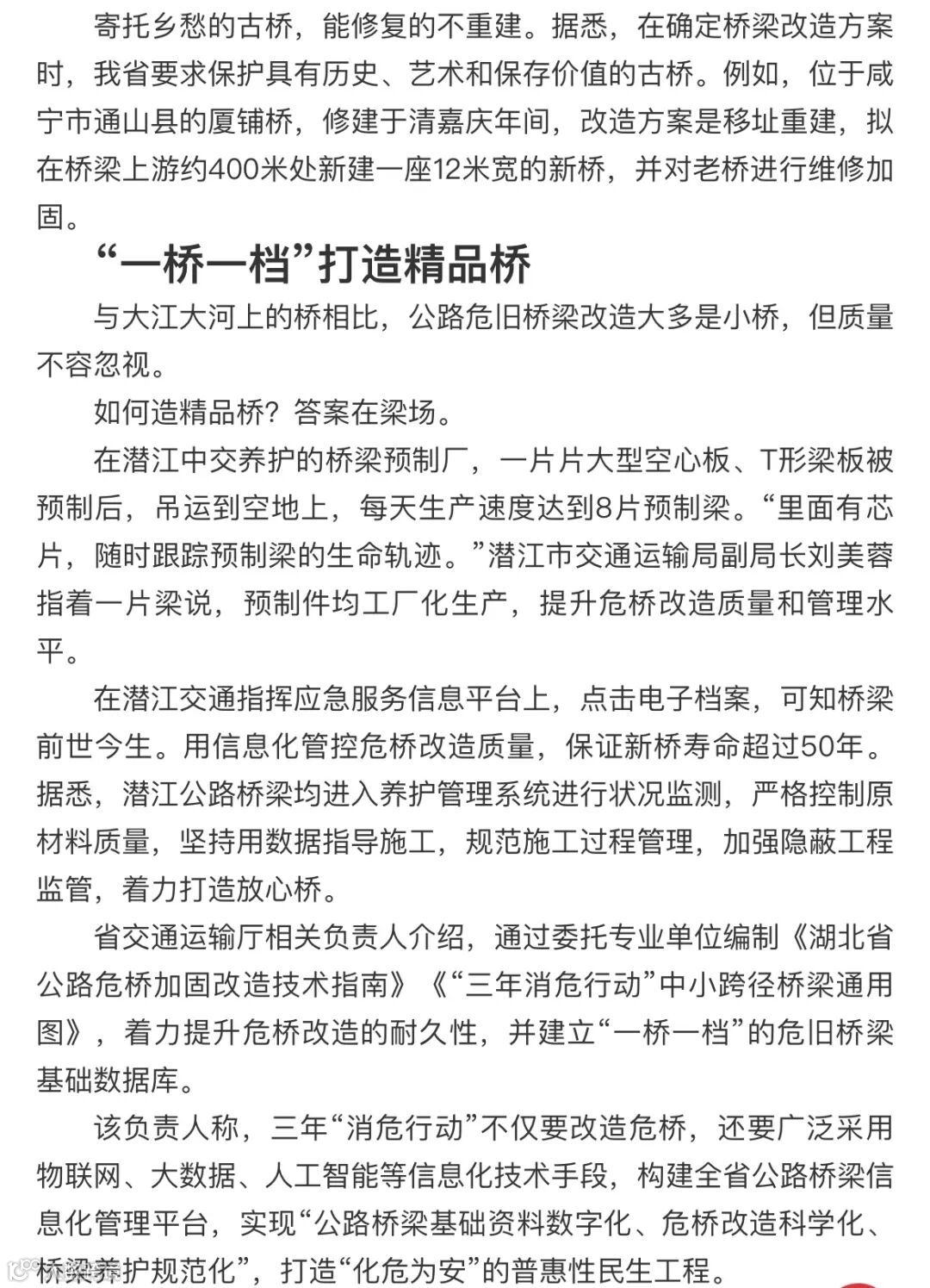 近日,公司潜江公路桥梁“三年消危”项目为了群众安心出行,让1666座桥梁转“危”为安,再次受到《湖北日报》关注报道。