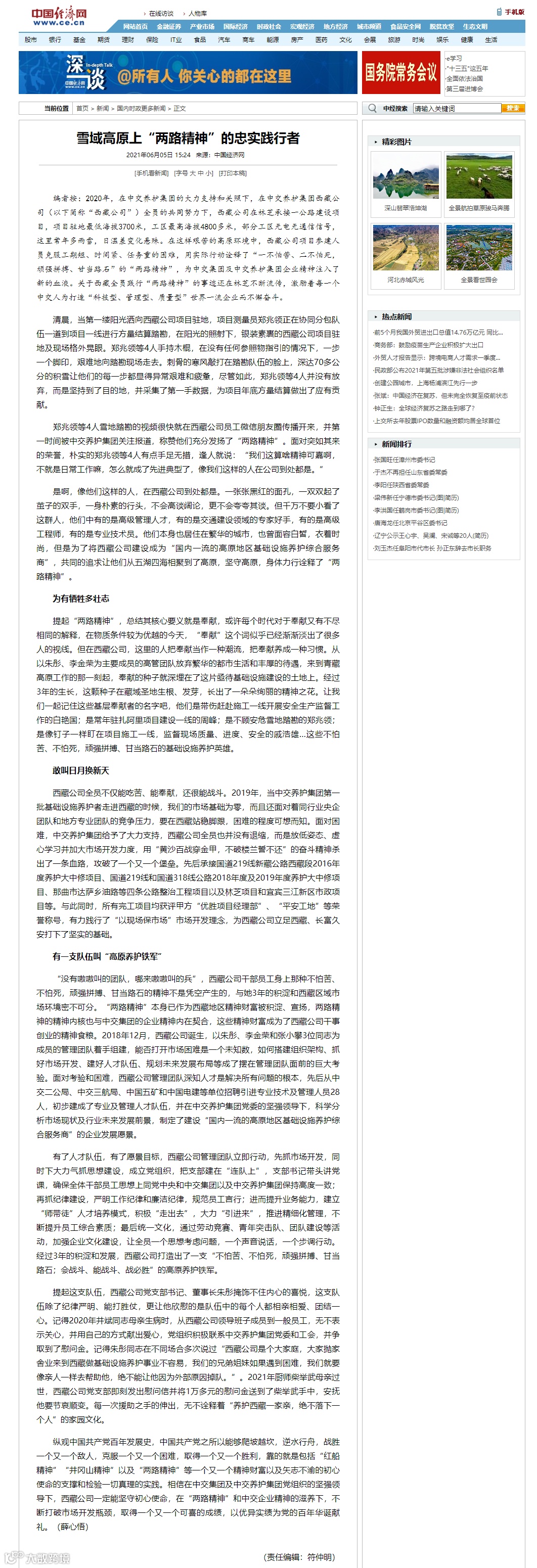 6月5日,中国经济网发布《雪域高原上“两路精神”的忠实践行者》文章,报道了公司林芝一公路建设项目人员在驻地最低海拔3700米,工区最高海拔4800多米艰苦的高原环境中克服工期短、时间紧、任务重的困难,用实际行动诠释了“一不怕苦、二不怕死,顽强拼搏、甘当路石”的“两路精神”。