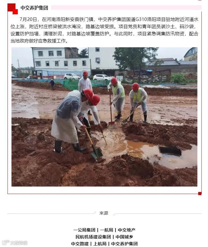 在河南洛阳新安县铁门镇,公司国道G310洛阳项目驻地附近河道水位上涨,附近村庄桥梁被洪水淹没,路基边坡受损。