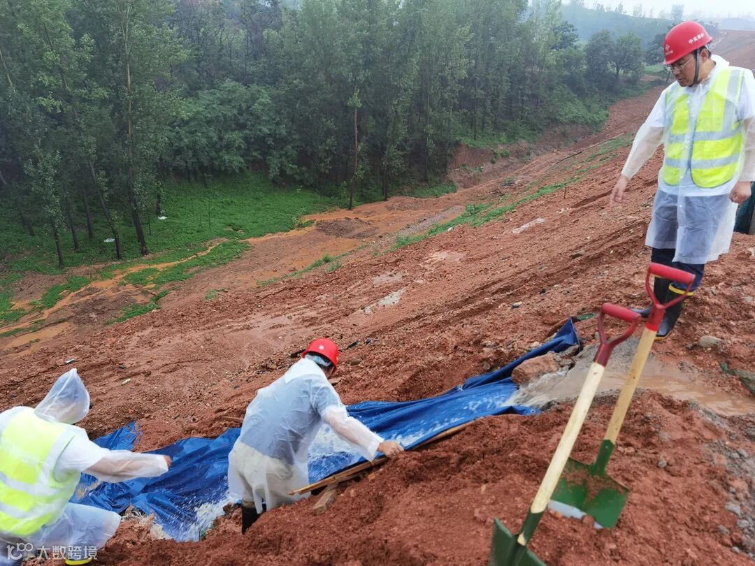 与此同时,项目紧急调集防汛物资,调配50把铁锹、100件雨衣、50双雨鞋、防雨布彩条布20捆、编制袋500个、挖掘机2台,转载机1台。项目党员和青年团员装沙土、码沙袋,设置防护挡墙,清理淤泥,对路基边坡覆盖防护。