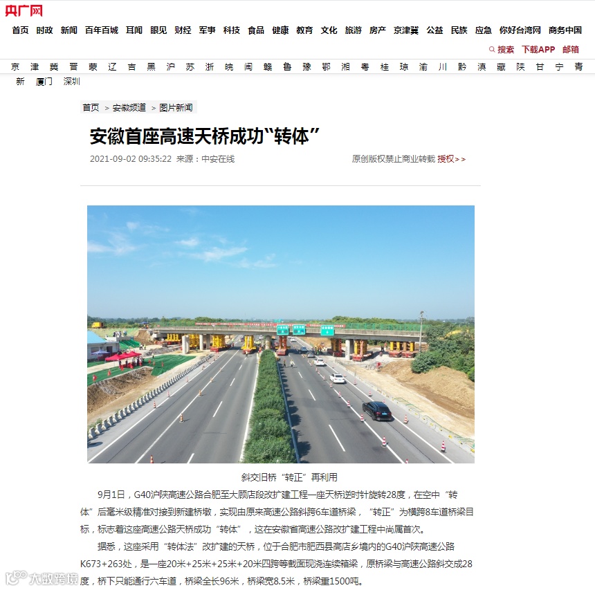 近日,央广网、中国交通新闻网、安徽网络广播电视台、安徽网、荆楚网、学习强国等多家媒体报道了公司在皖成功实施1500吨跨线天桥原位转体项目,实现半小时原地转身。