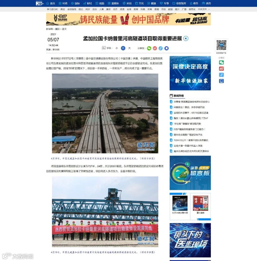 近日,新华网关注报道了公司孟加拉卡纳普里河底隧道项目连接线东岸高架桥箱梁全部架设完成情况;继《湖北日报》、《中国交通报》报道后,《中国交通报》再次发布了《潜江巧改危桥,让路小龙虾》文章,报道公司潜江项目在危桥改造道路上是如何给小龙虾的生长让路,实现虾农收入;《交通建设报》报道公司中标国家高速公路网G5612大理至临沧高速公路南涧至云县段勘察设计项目,中标金额约1亿元,快随小编一起来看看吧。