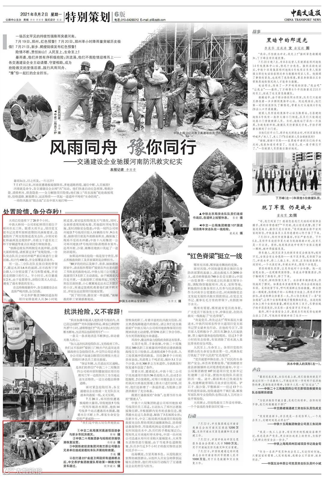 8月2日,《中国交通报》特别策划栏目、"中交报在路上"微信公众号刊登了公司主动请缨赴河南抢险救灾,风雨同舟、“豫”你一起扛的企业担当。