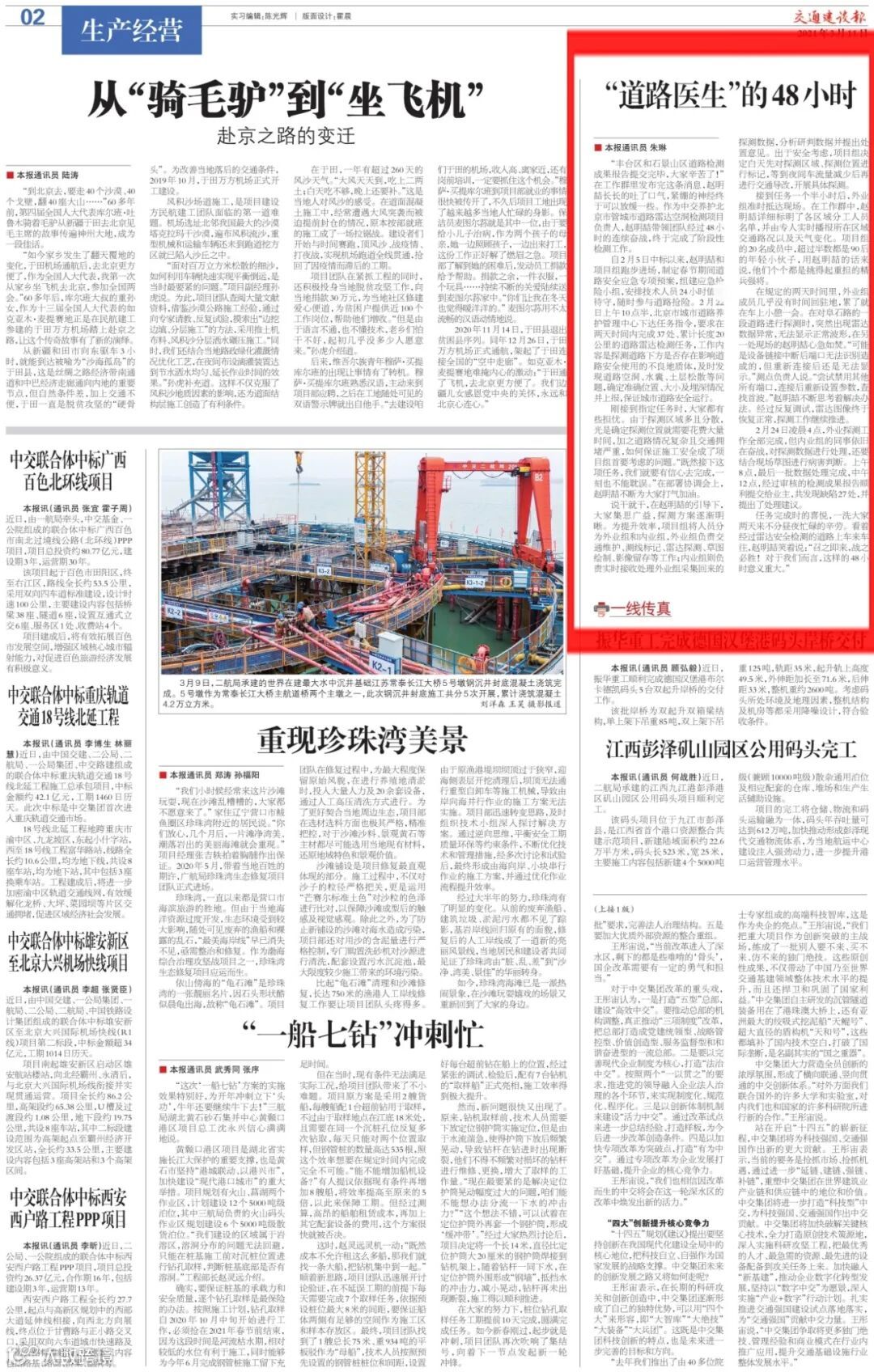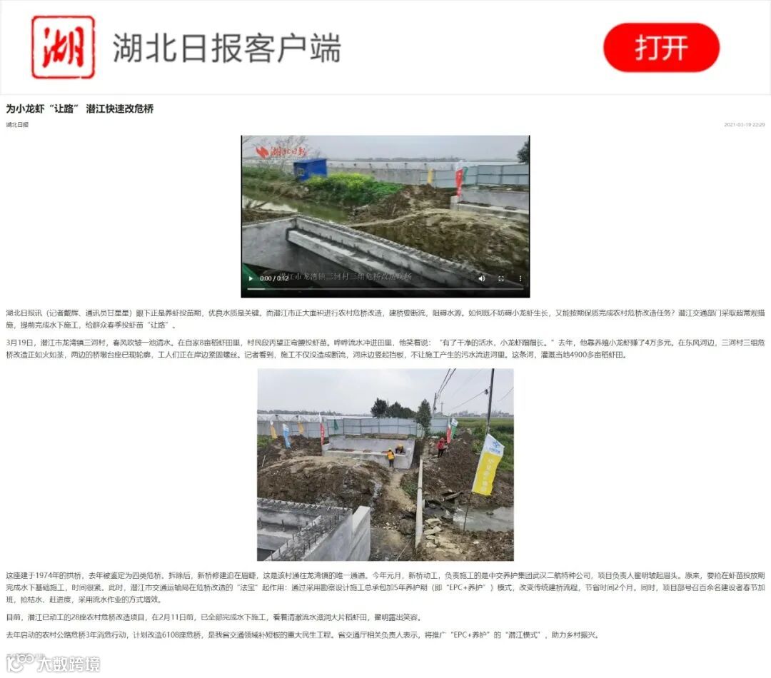 3月22日,湖北日报客户端刊登——为小龙虾“让路” 潜江快速改危桥,公司采用勘察设计施工总承包加5年养护期(即“EPC+养护”)模式,改变传统建桥流程,推广“EPC+养护”的“潜江模式”,助力乡村振兴。
