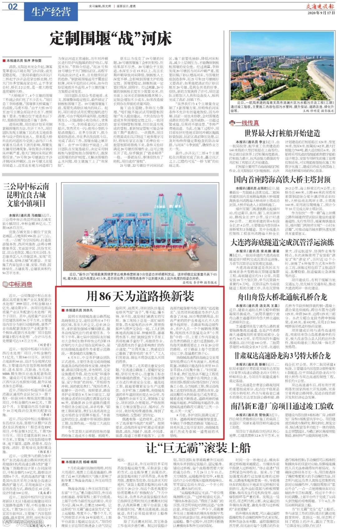近日,多家媒体关注报道公司。交通建设报刊登:用86天为道路换新装,中国经济网刊登:央地携手打造高端公路养护品牌公司,兰溪新闻频道报道关注公司横山大桥老桥拆除工程项目。