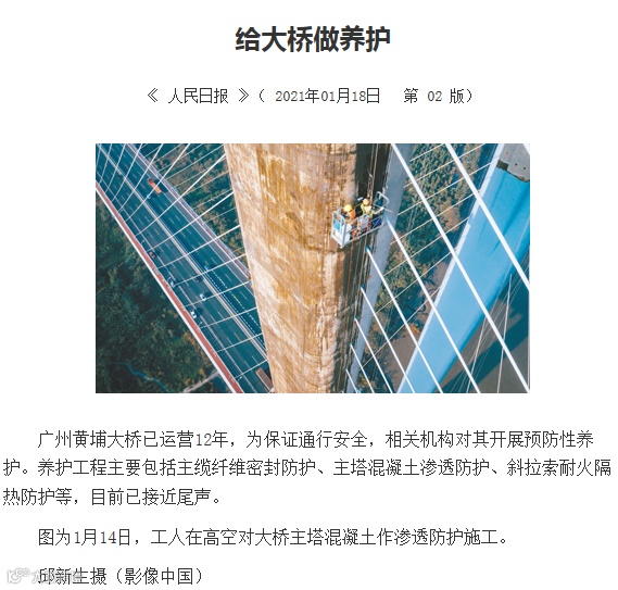 1月18日,《人民日报》刊发图片新闻,报道公司黄埔特大桥养护项目,记录了中交养护人在百米高空为大桥养护作业的瞬间。随小编一睹为快~