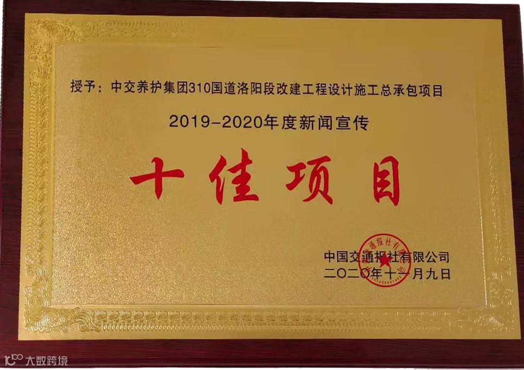 中交养护集团310国道洛阳段改建工程设计施工总承包项目获得中国交通报2019-2020年度新闻宣传“十佳项目”称号。