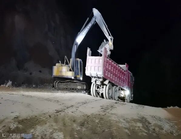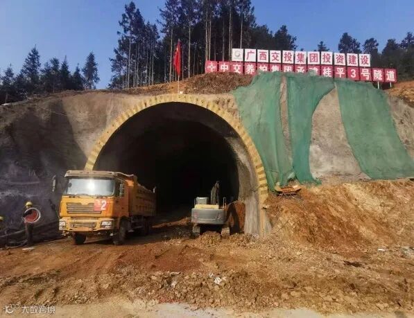 桂平三号隧道进口施工现场卡车来往运送隧道出渣,整个施工现场有条不紊,春节期间完成进尺7.2米。