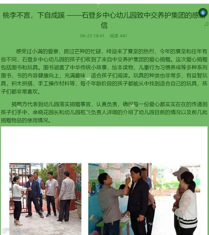 ——石登乡中心幼儿园致中交养护集团的感谢信