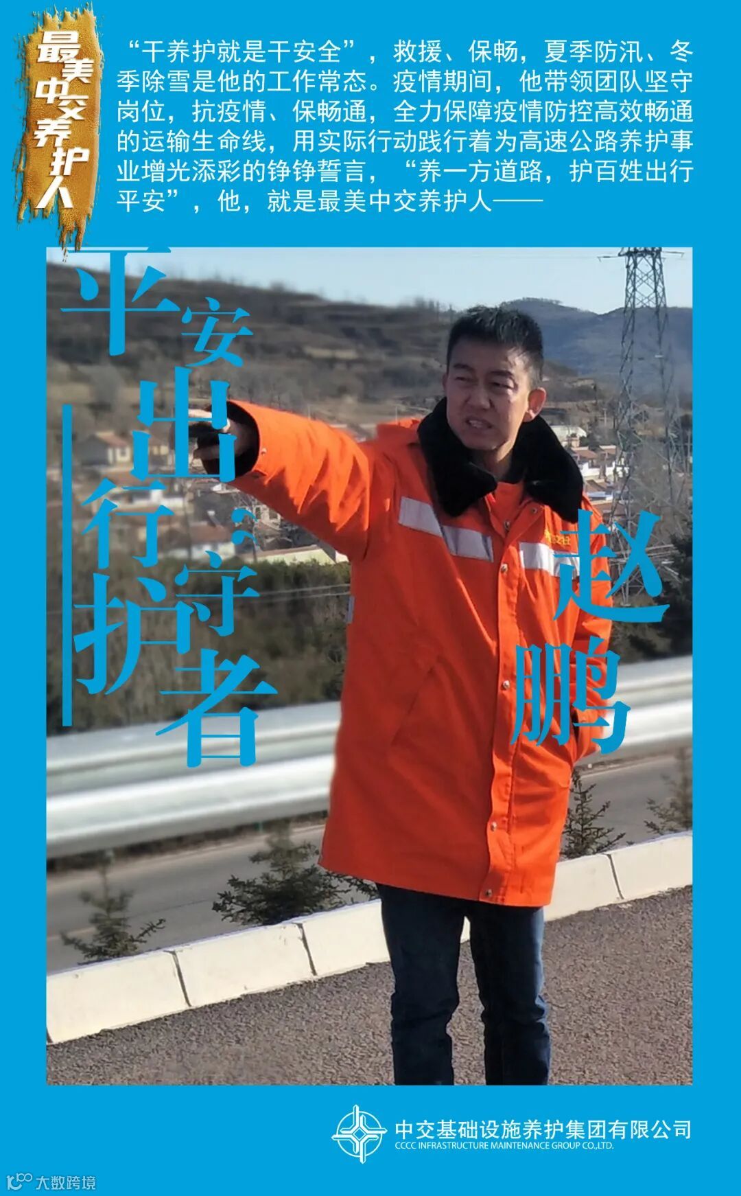 致最美的他:“干养护就是干安全”,救援、保畅,夏季防汛、冬季除雪是他的工作常态。疫情期间,他带领团队坚守岗位,抗疫情、保畅通,全力保障疫情防控高效畅通的运输生命线,用实际行动践行着为高速公路养护事业增光添彩的铮铮誓言,“养一方道路,护百姓出行平安”,他就是最美中交养护人,平安出行“守护者”,赵鹏。