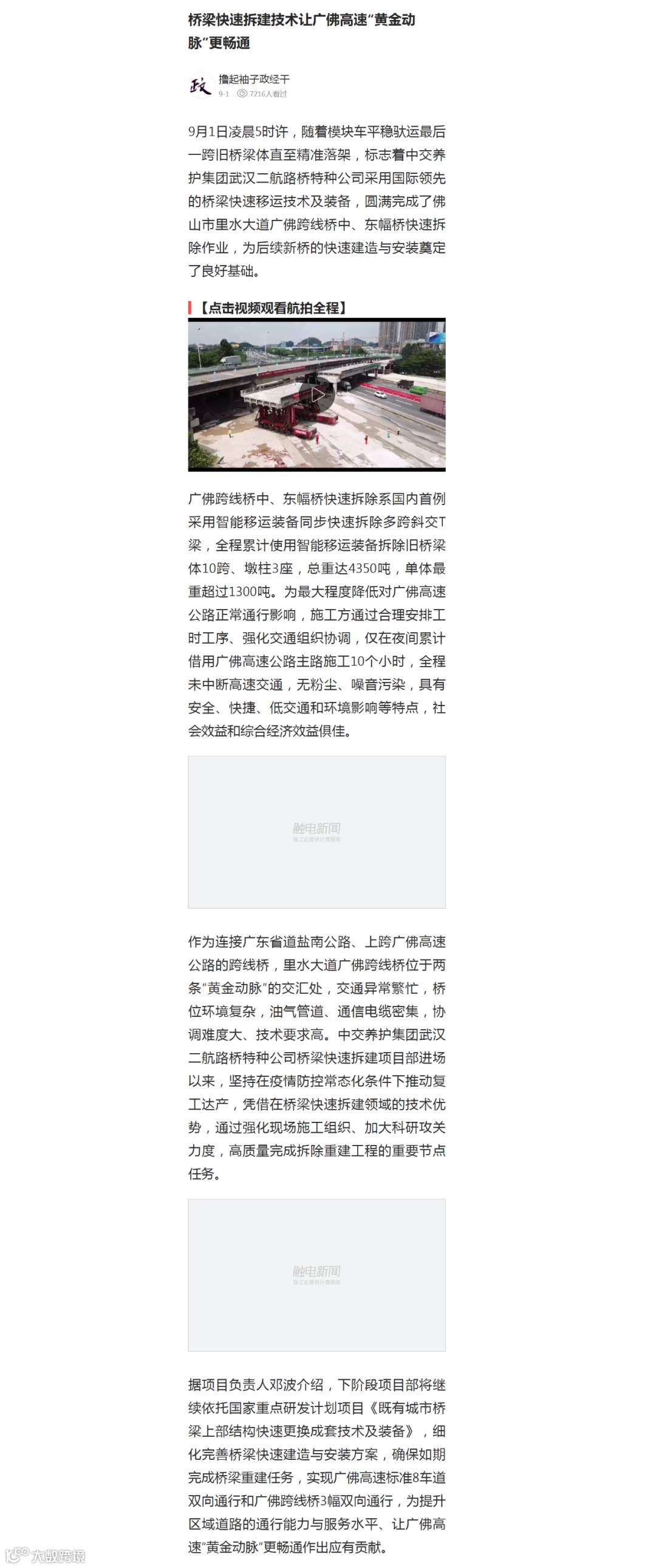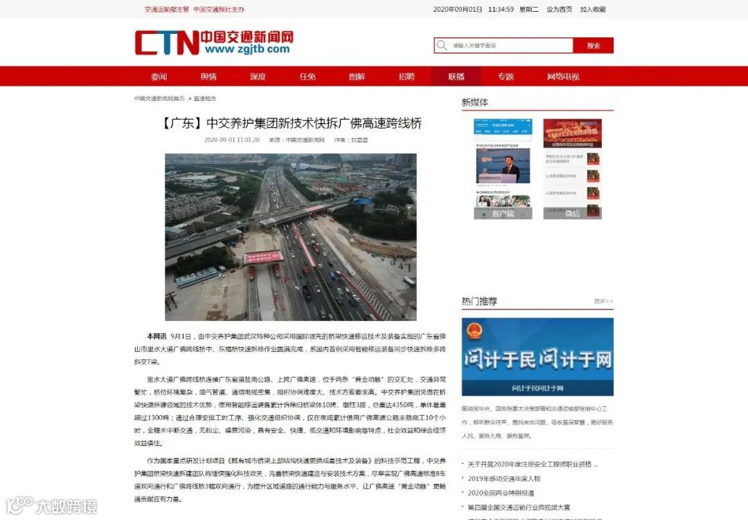近日,由中交养护采用国际领先的桥梁快速移运技术及装备实施的广东省佛山市里水大道广佛跨线桥中、东幅桥快速拆除作业圆满完成,系国内首例采用智能移运装备同步快速拆除多跨斜交T梁。