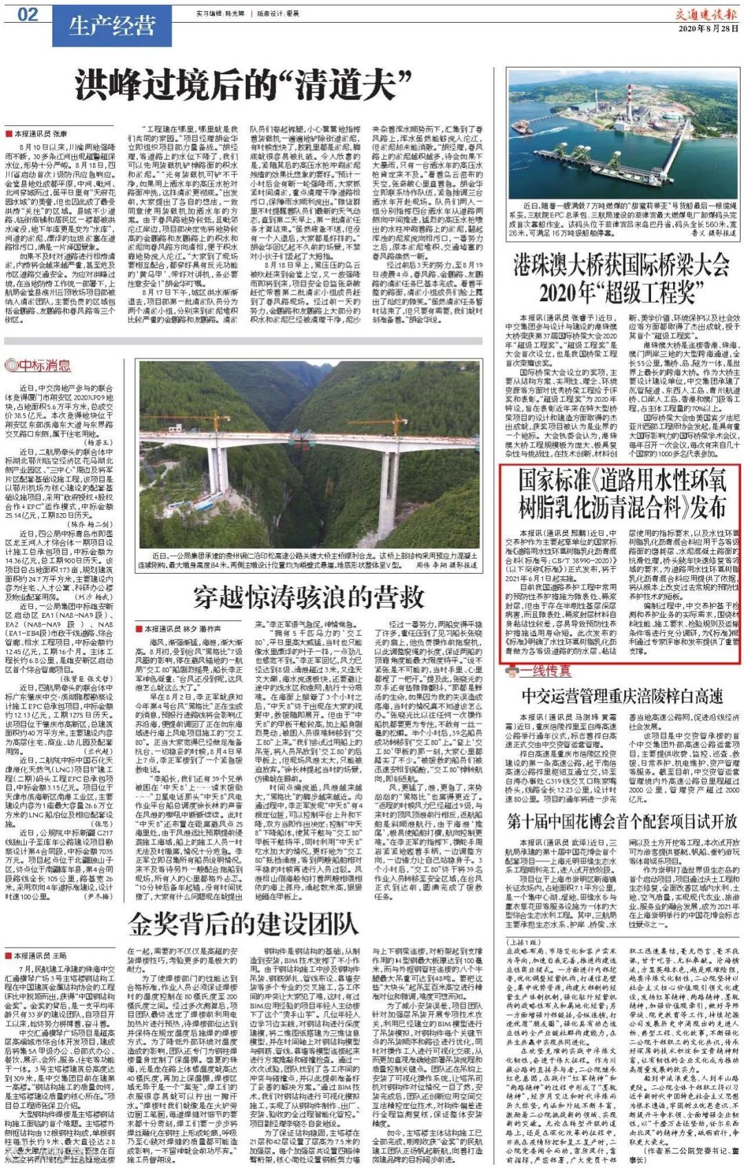 近日,交通建设报刊登了由中交养护作为主要起草单位参与编制的国家标准《道路用水性环氧树脂乳化沥青混合料》正式发布的新闻。公司昆明市市容改造提升项目也被昆明市电视台报道。
