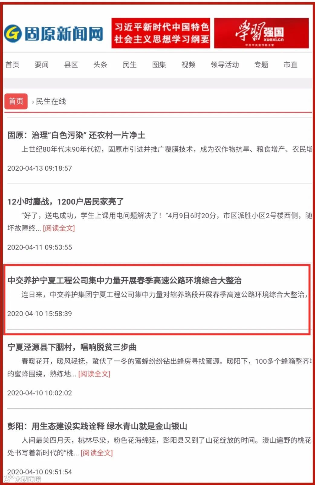近日,中交养护集团宁夏工程公司固原养护项目专项整治行动得到了社会各界和当地群众的一致好评,中国交通新闻网、华兴时报、宁夏交通广播、固原日报新闻客户端、固原新闻网等多家媒体相继报道。