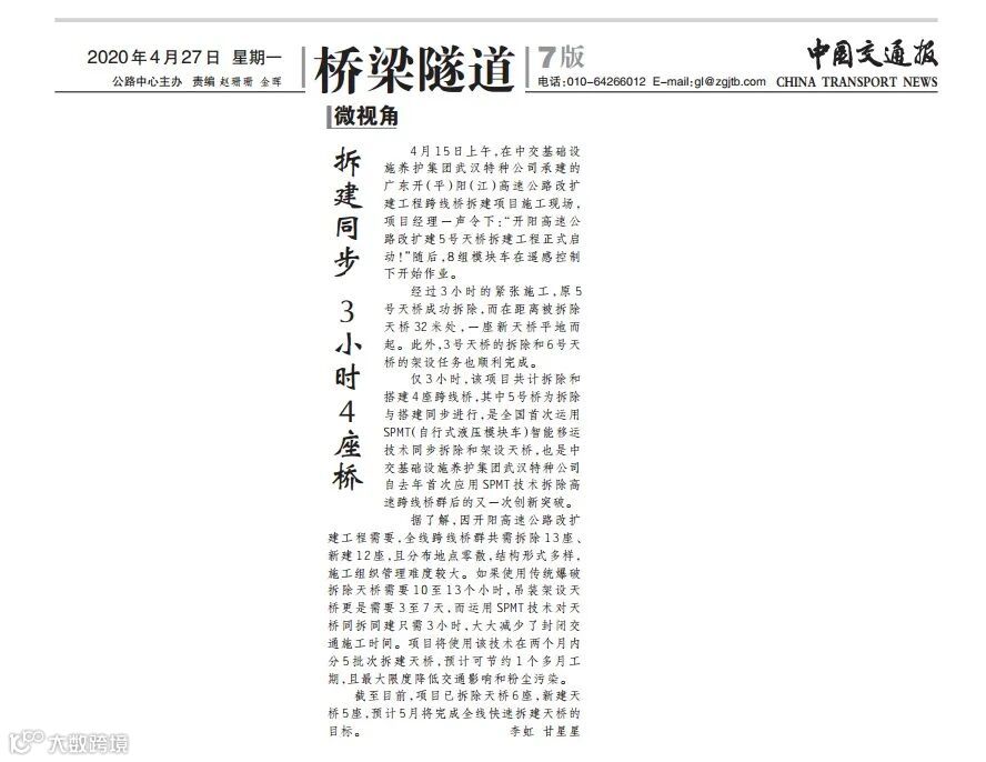 4月24日和27日,央广网和中国交通报对公司武汉特种公司广东开(平)阳(江)高速公路改扩建工程跨线桥拆建项目刊发报道。