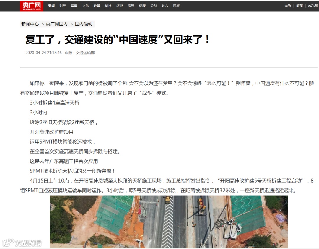 据了解,因开阳高速公路改扩建工程需要,全线跨线桥群共需拆除13座、新建12座,且分布地点零散,结构形式多样,施工组织管理难度较大。如果使用传统爆破拆除天桥需要10至13个小时,吊装架设天桥更是需要3至7天,而运用SPMT技术对天桥同拆同建只需3小时,大大减少了封闭交通施工时间。项目将使用该技术在两个月内分5批次拆建天桥,预计可节约1个多月工期,且最大限度降低交通影响和粉尘污染