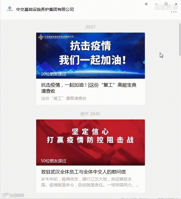 做好信息上传下达。及时发布党中央、国务院的决策部署,转载国资委、中交集团的相关信息。第一时间组建“疫情防控值班”工作微信群,建立信息报送机制,通报共享疫情信息,传达防控工作部署,高效统计员工动态,密切掌握员工健康状况,确保工作信息互通,人人明责,有力保证公司应急防控工作开展。2月6日(网络办公复工首日)组织公司总部、所属各单位员工关注收看中交集团暨中国交建节后复工工作部署会视频会,将防控和复工相关最新指示精神进行传达。