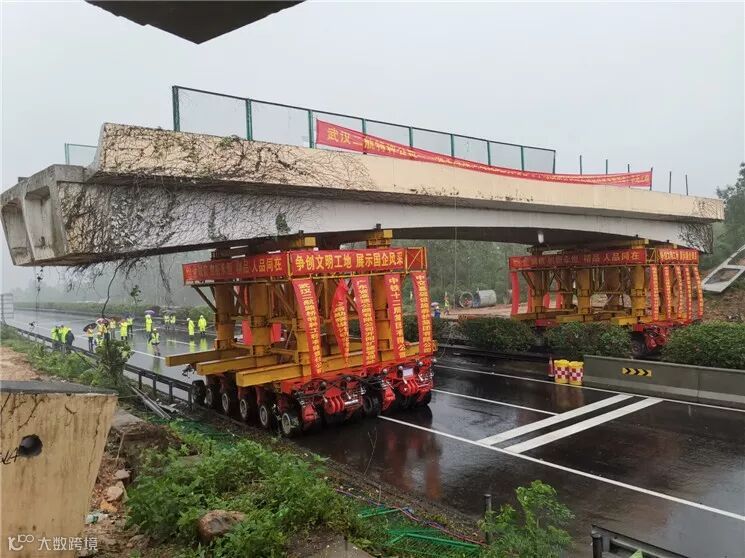 移除工程采用了12台共72轴线模块车,每座桥移运梁段重约600吨,最大移运距离365米。在完成了桥梁顶升、模块车直行、斜行、转体等过程后,最终在没有进行爆破、未造成重粉尘污染的情况下,圆满完成了桥梁瞬移。