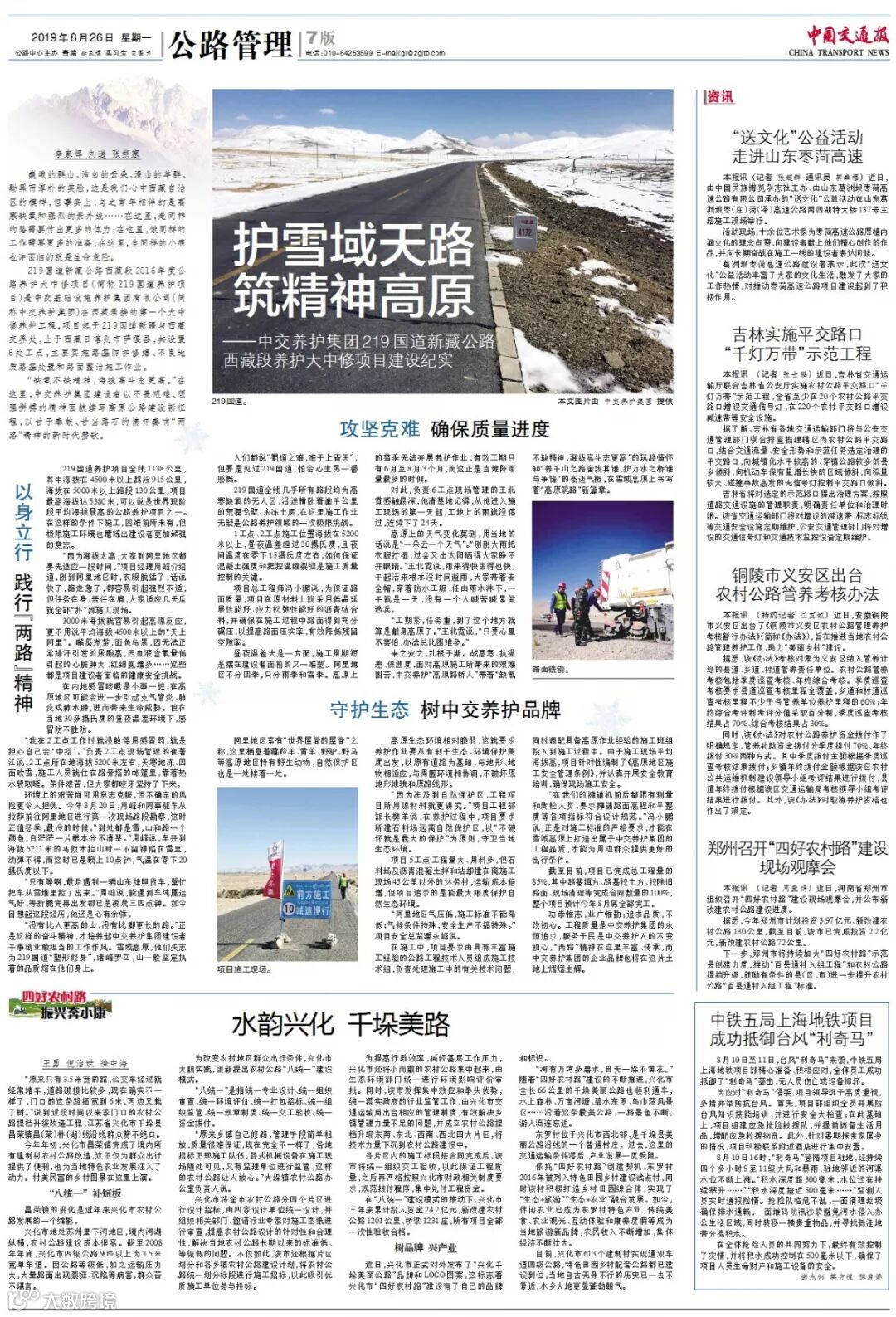 8月26日《中国交通报》以《护雪域天路 筑精神高原》为题,报道养护集团承建的219国道新藏公路西藏段养护大中修项目建设纪实情况。