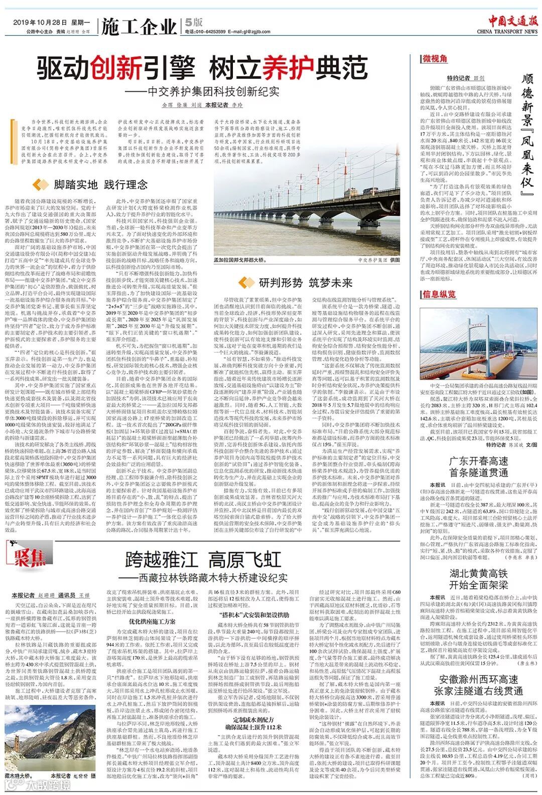 10月28日,《中国交通报》以《驱动创新引擎 树立养护典范—中交养护集团科技创新纪实》为题报道了公司科技创新发展历程,以下为全文报道: