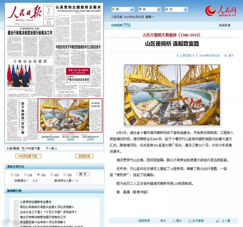 6月3日,《人民日报》在头版以《山区便民桥 连起致富路》为题刊登图片新闻,报道养护集团承建的竹山城区交通工程项目最新进展。