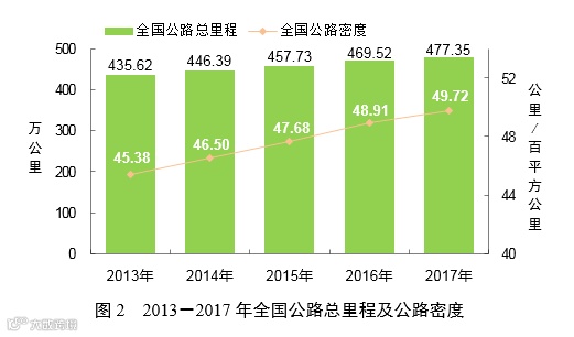 年末全国公路总里程477.35万公里,比上年增加7.82万公里。公路密度49.72公里/百平方公里,增加0.81公里/百平方公里。公路养护里程467.46万公里,占公路总里程97.9%。
