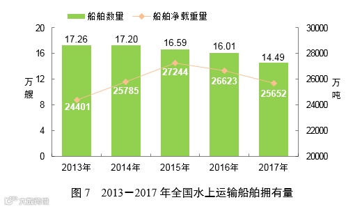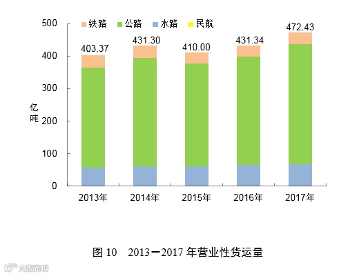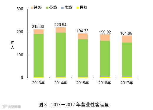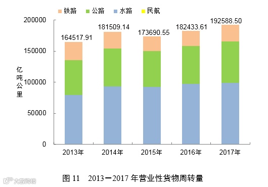2017年,完成营业性客运量184.86亿人,比上年下降2.7%,旅客周转量32812.55亿人公里,增长5.0%,营业性货运量472.43亿吨,增长9.5%,货物周转量192588.50亿吨公里,增长5.6%。