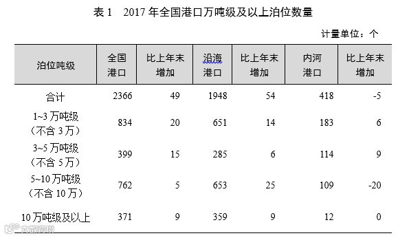 年末全国港口拥有万吨级及以上泊位2366个,比上年增加49个。其中,沿海港口万吨级及以上泊位1948个,增加54个;内河港口万吨级及以上泊位418个,减少5个。