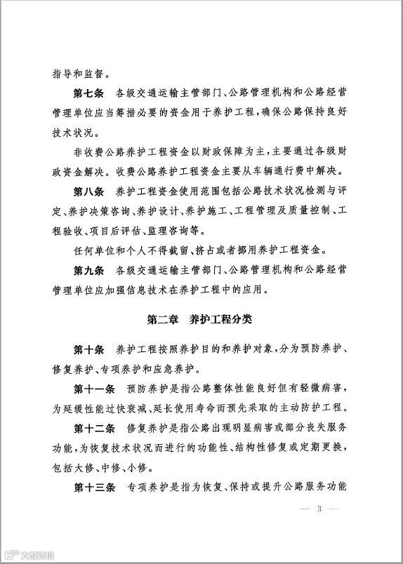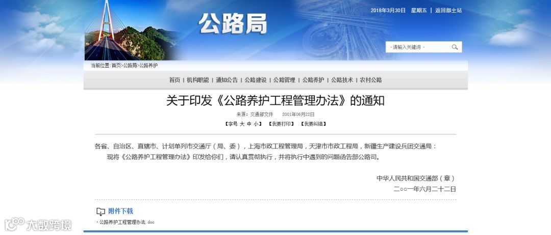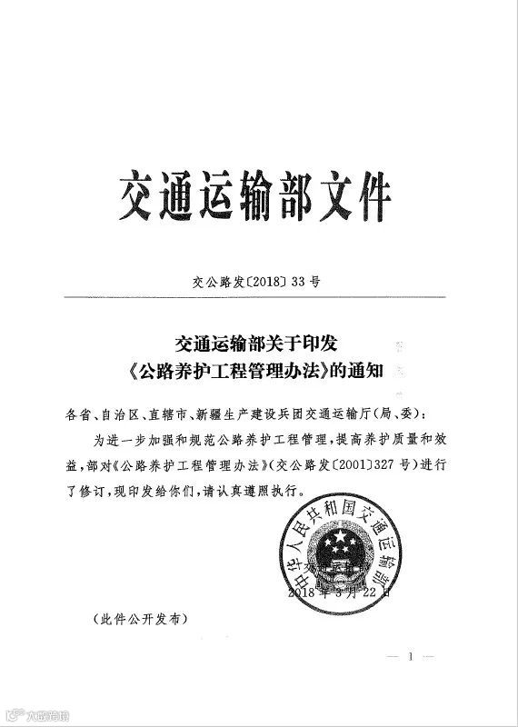 导读:近日,交通运输部正式公开发布《公路养护工程管理办法》,此办法是在2001年《公路养护工程管理办法》的基础上,