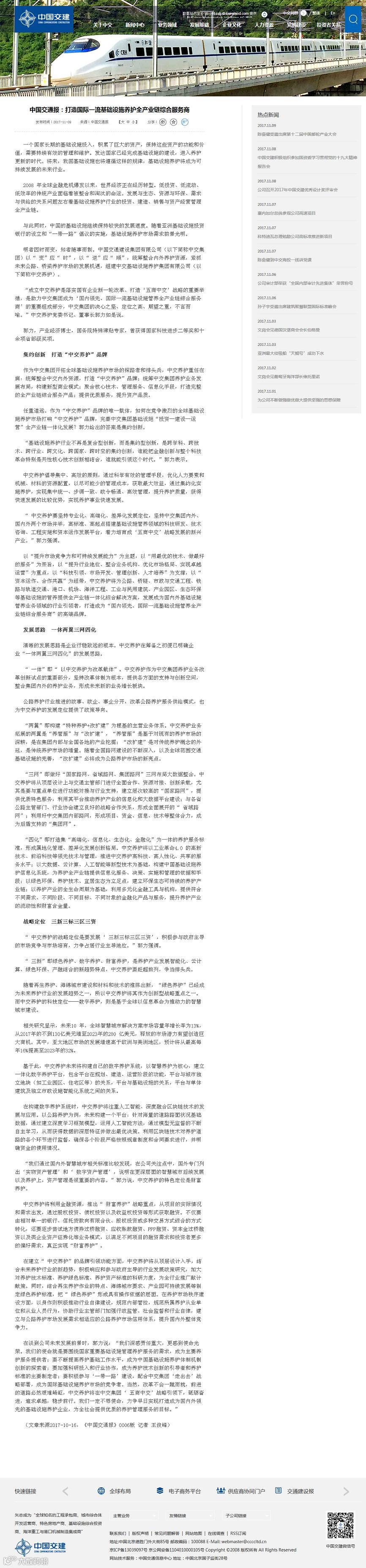 值中交基础设施养护集团有限公司成立之际,2017年10月16日《中国交通报》在“砥砺奋进,大道为公——喜迎十九大公路交通发展巡礼”系列专题中,于第6版通版对养护集团进行了专题报道《打造国际一流基础设施养护全产业链综合服务商》。通过对中交养护集团党委书记、董事长郭力的专访,首次公开、全面、深入阐述了养护集团的发展目标、发展思路和战略定位。