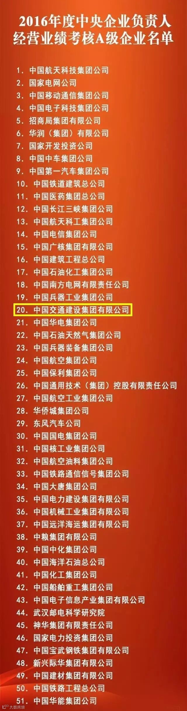 7月12日,国务院国资委公布中央企业负责人经营业绩考核A级企业名单。经国资委考核认定,中国交建在2016年经营业绩测试评价中利润总额、经济增加值、成本费用总额占营业总收入比重、应收账款周转率四项考核指标均获满分,再次荣获A级企业荣誉。这是公司继2005年以来连续第12年获此荣誉,是十一家获得“十二连A”的中央企业之一,也是建筑央企中唯一获得“十二连A”的企业。
