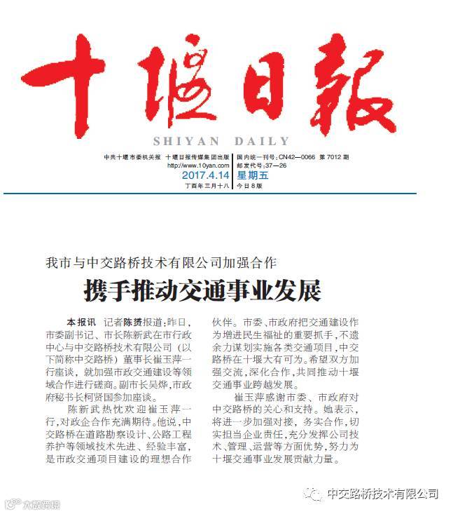 4月13日,公司董事长、总经理崔玉萍一行赴湖北省十堰市访问交流,拜会了十堰市委书记张维国、市长陈新武,双方就十堰市交通以及市政基础设施领域项目合作进行了会谈。公司副总经理徐帮凯陪同会谈。