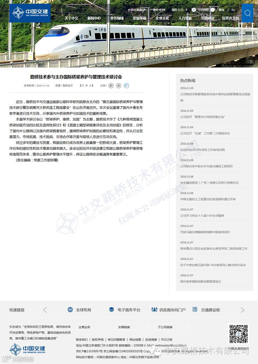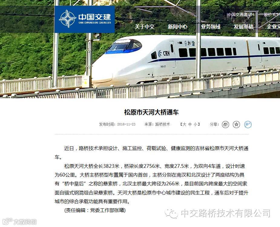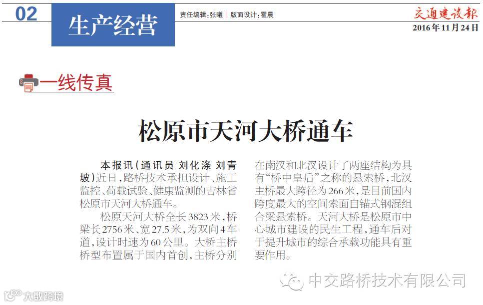 近期,公司松原天河大桥正式通车,中国交通报、交通建设报、中国交建网站分别对此消息进行了报道,中国交建网站报道了公司参与主办国际桥梁养护与管理技术研讨会的新闻,此外,交通建设报报道了公司中标北京轨道交通第三方监测项目。
