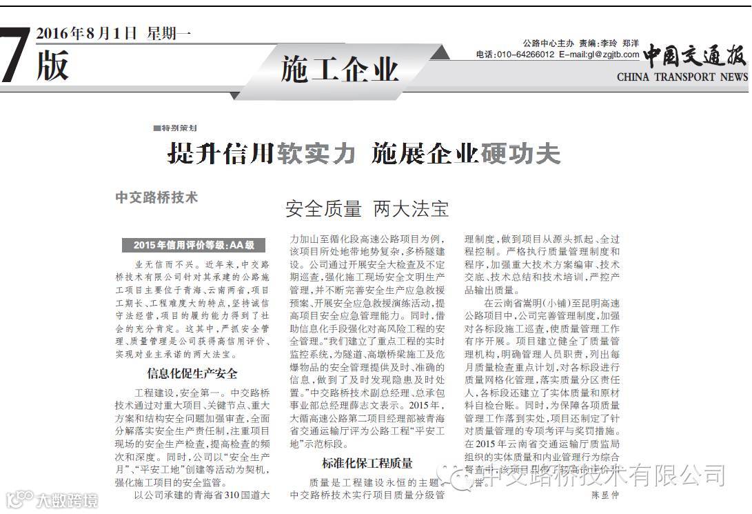 《中国交通报》特别策划“提升信用软实力 施展企业硬功夫”:中交路桥技术——安全质量 两大法宝