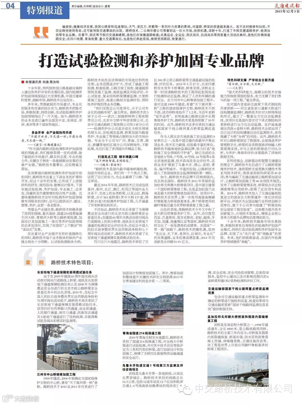 >>>>近日,《交通建设报》以特别报道的形式,对路桥技术瞄准国内检测养护加固市场,抢抓机遇,深耕十年,打造试验检测和养护加固专业品牌进行了报道,小编特摘于此,以期与您分享。