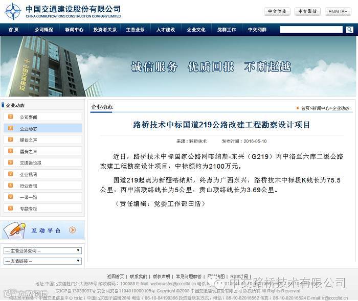 中国交建网站:路桥技术中标国道219公路改建工程勘察设计项目