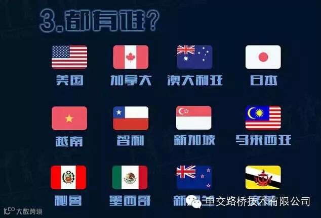此次达成TPP协定的共有12个国家:美国、日本、澳大利亚、加拿大、新加坡、文莱、马来西亚、越南、新西兰、智利、墨西哥和秘鲁,其经济规模占全球经济总量的40%。