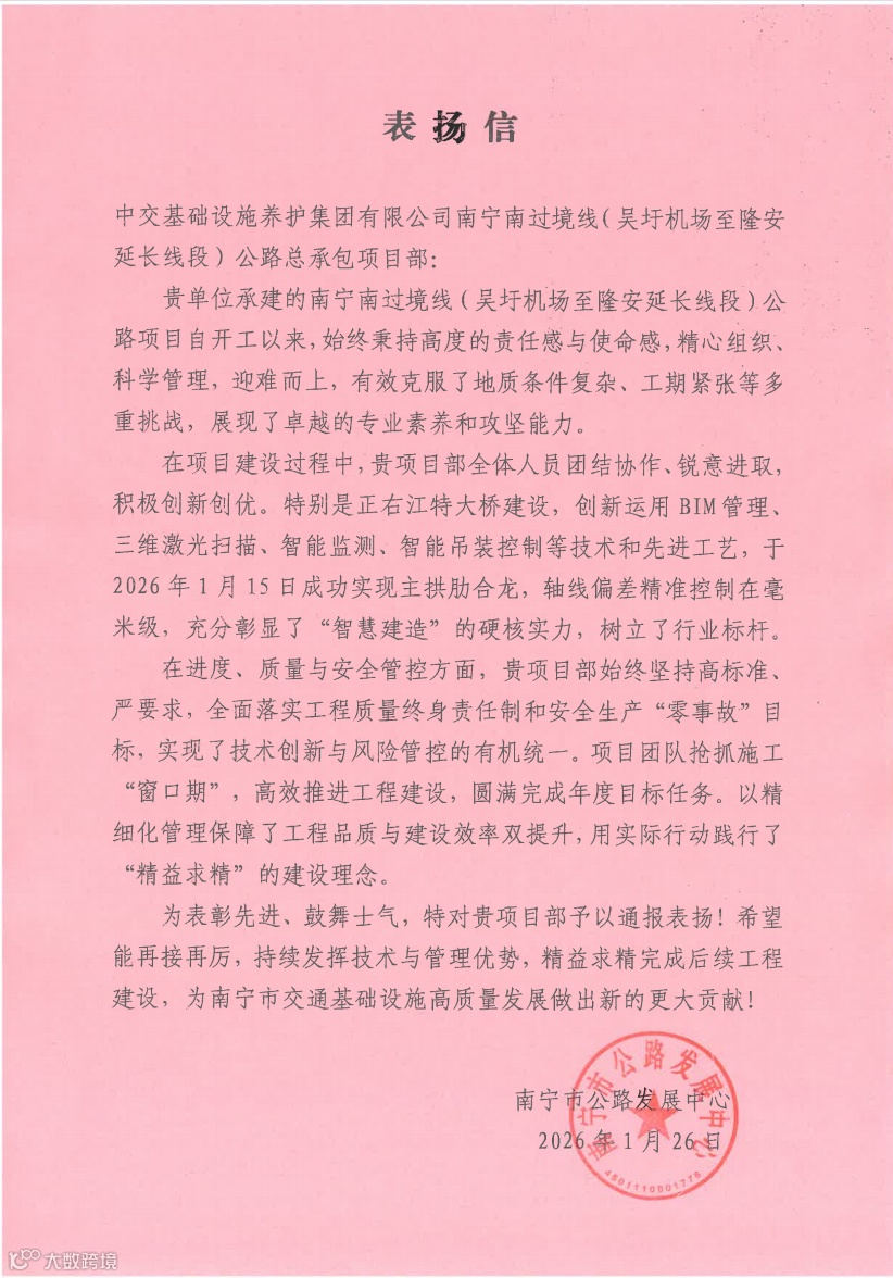 近日,南宁二环项目喜讯连连,收获满满。项目收到南宁市公路发展中心发来的表扬信并荣获中交集团暨中国交建2025年度“平安工地”以及中国建筑业协会2025年(第三届)工程项目管理数字化竞赛三等奖。