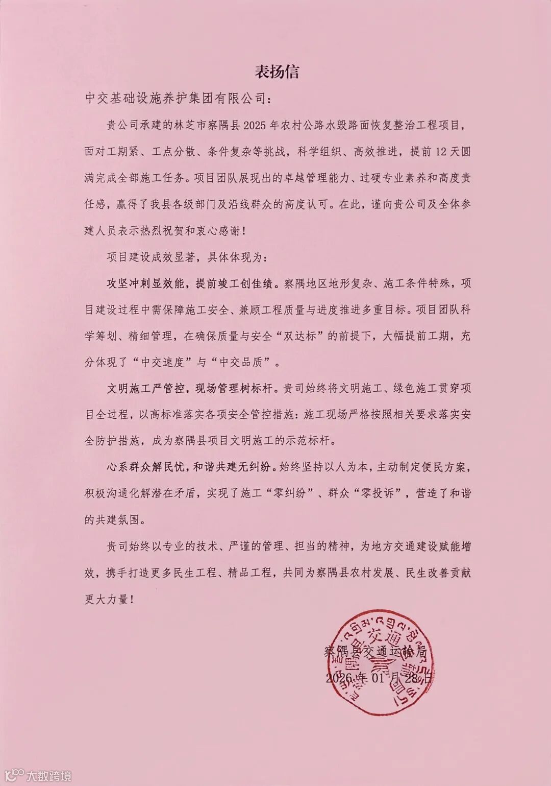 近日,项目先后收到业主单位察隅县交通运输局发来的表扬信,以及察隅县古玉乡玉和村村委会赠送的锦旗,对公司及全体参建人员的辛勤付出与突出贡献表示感谢与赞誉。