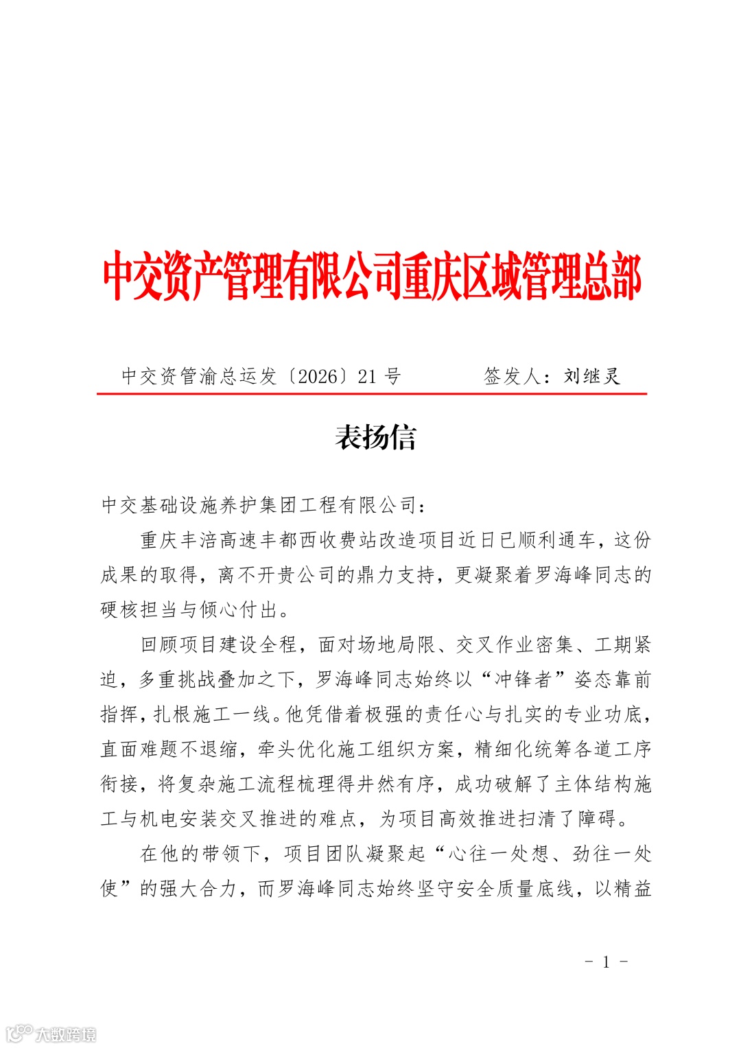 信中指出,丰都西收费站改造项目建设期间,面临场地局限、交叉作业密集、工期紧迫等多重挑战。罗海峰同志始终以 “冲锋者” 姿态靠前指挥,扎根施工一线,凭借极强的责任心与扎实的专业功底,直面难题不退缩,牵头优化施工组织方案,精细化统筹各道工序衔接,将复杂施工流程梳理得井井有条,成功破解了主体结构施工与机电安装交叉推进的难点,为项目高效推进扫清了障碍。