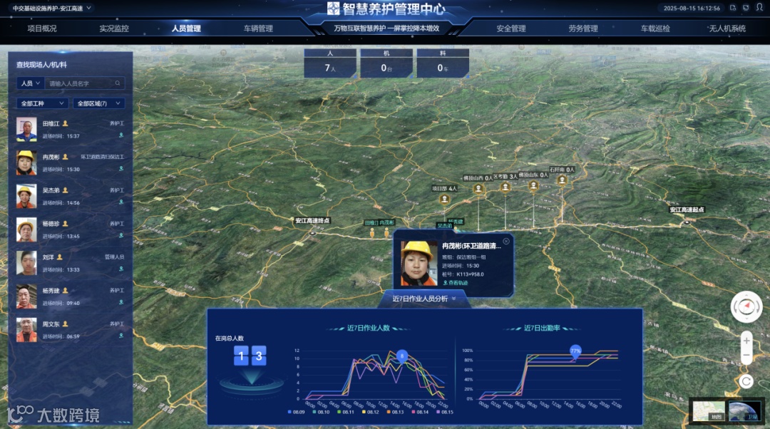 人员定位,实现在线管理。利用小程序扫码录入身份信息,结合身份证信息与人脸识别,通过公安库校验自动进行人证对比,人证校验不一致禁止入场,解决了人员流动频繁零工登记不及时、从源头降低了项目用工风险等问题,用工风险发生率下降80%以上。同时,利用手机APP自带的北斗定位、无网环境定位功能进行自动考勤及定位,实时掌握作业人员的在岗情况及活动区域。考勤数据上传实时性提升至98%,替代传统人工点名模式,每月节约管理工时约120小时,人工成本降低25%;通过实时在岗数据动态调配人员,跨区域作业人员调配响应时间从2小时缩短至30分钟,调配效率提升75%,进一步保障养护作业高效推进。