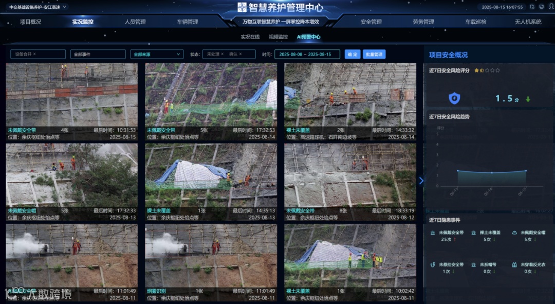 AI赋能,实现智能巡检。通过AI智能影像识别等新技术与公路养护深度融合,巡检车安装AI智能摄像头、高精度定位设备,结合道路AI模型,运用物联网、大数据分析、人工智能、AI算法、北斗定位等技术,对高速公路进行日常巡查,病害识别精准度提升至95%以上,单向50公里路段的巡检时长从传统人工徒步巡检13小时缩短至40分钟,效率提升95%。不仅提高了工作效率,还减少了人工巡检的安全隐患,为日常养护维修提供了可靠的数据支持,推动了公路养护工作的智能化和高效化。